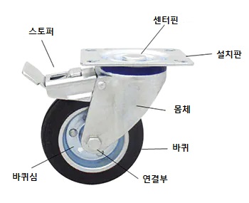 물건의 하단에 설치해 이동을 용이하게 해주는 것이 "바퀴"인데요. 캐스터는 그 주요 부분인 바퀴뿐만 아니라 몇 개의 부분으로 나누어져 구성되어 있어요.