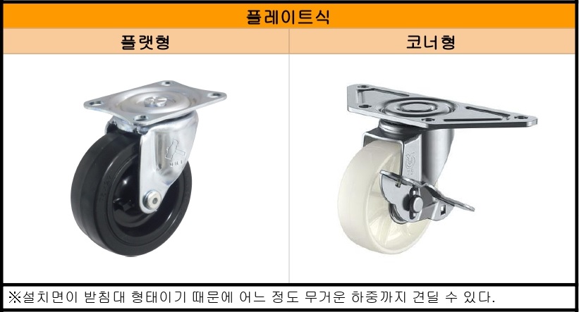 플레이트 타입은 그 모양에 따라 플랫형과 코너형의 2 종류가 있어요. 둘 다 설치면이 받침대 형태로 되어있기 때문에 어느 정도는 무거운 하중까지 견딜 수 있어서 다양한 용도로 이용되고 있어요. 또한 설치 부분에 베어링이 있으면 회전할 때 매우 스무스하게 움직여요. 플레이트 타입의 캐스터를 설치할 나사는 설치 구멍의 직경보다 한 사이즈 작은 것을, 그리고 설치 방법이나 장소에 적합한 나사를 선택해 주세요.