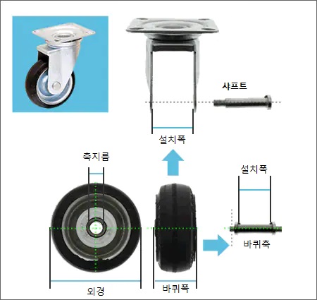 3. 캐스터의 경우는 금구의 설치 폭과 바퀴 보스 폭이 일치하는지 여부